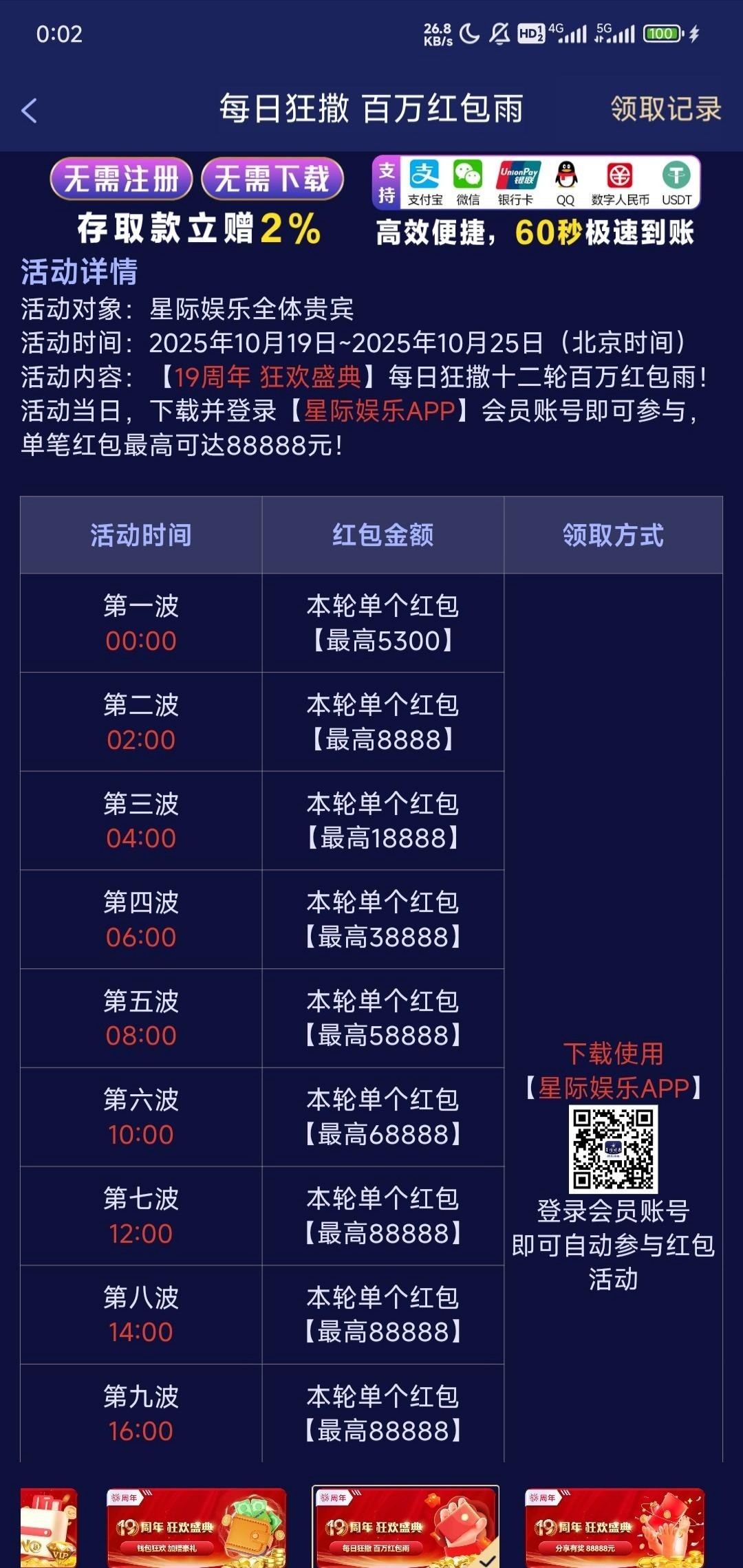 星际娱乐有周年历史存款彩金,中午12点后去领,有等级的去看看,每两小时还能抢一次红包 053.com