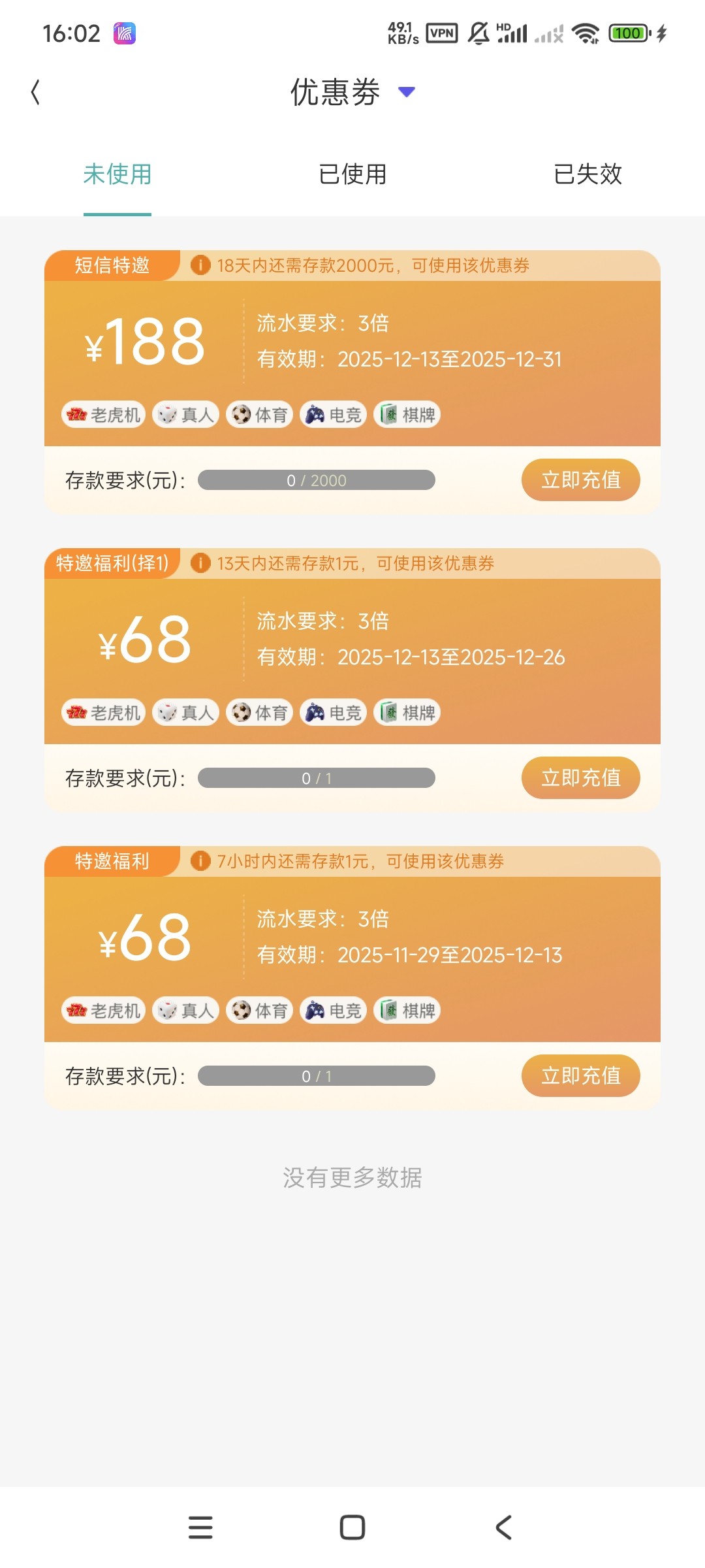 别冲啊,你这个平台最低充50充50,你用那个卷他会显示你活跃度不足,用不了这个的这平台的电子的要死