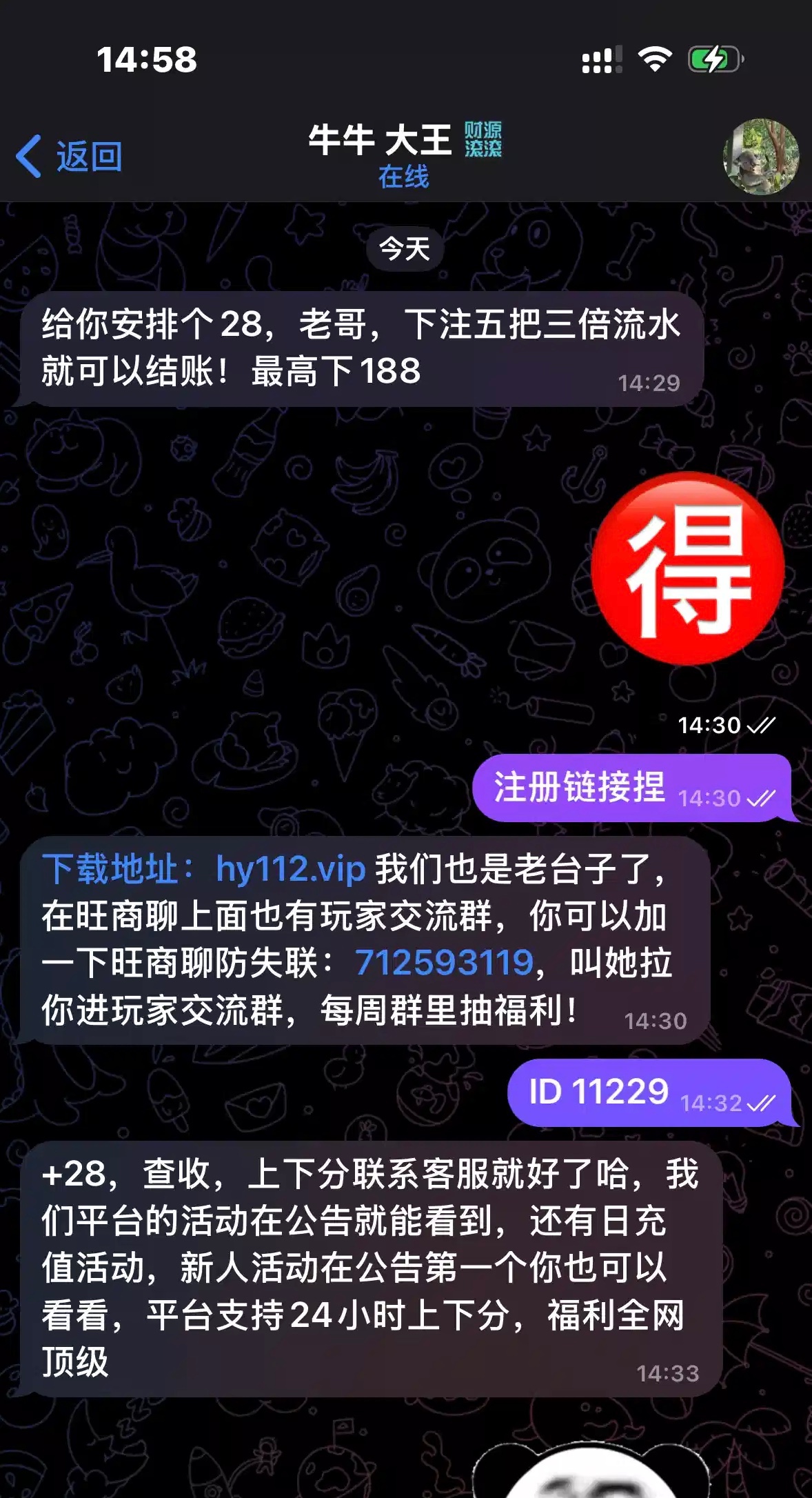 先准备最近下注28的记录,然后加他,他会查你最近有没有玩,不用加那个旺旺找他飞机申请我没打出来@a789332