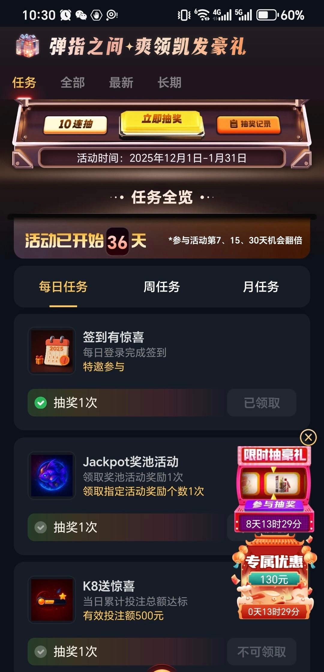 登录账号,我图里这个限时抽好礼,点进去,每天都可以签到(签到之前随便点个电子进去不用玩过几分钟再回这个界面就可以签到),基本就是三种奖品,红包或者pp免费旋转或者百家乐门票,都有用。很久没充值过一个月一直在白嫖,pp那个爆奖也有几十,然后自己去打过关啥的,我今天今天十多块又打上400,有号的可以看看自己有没有这个活动,不知道是不是都有。网址k8.com