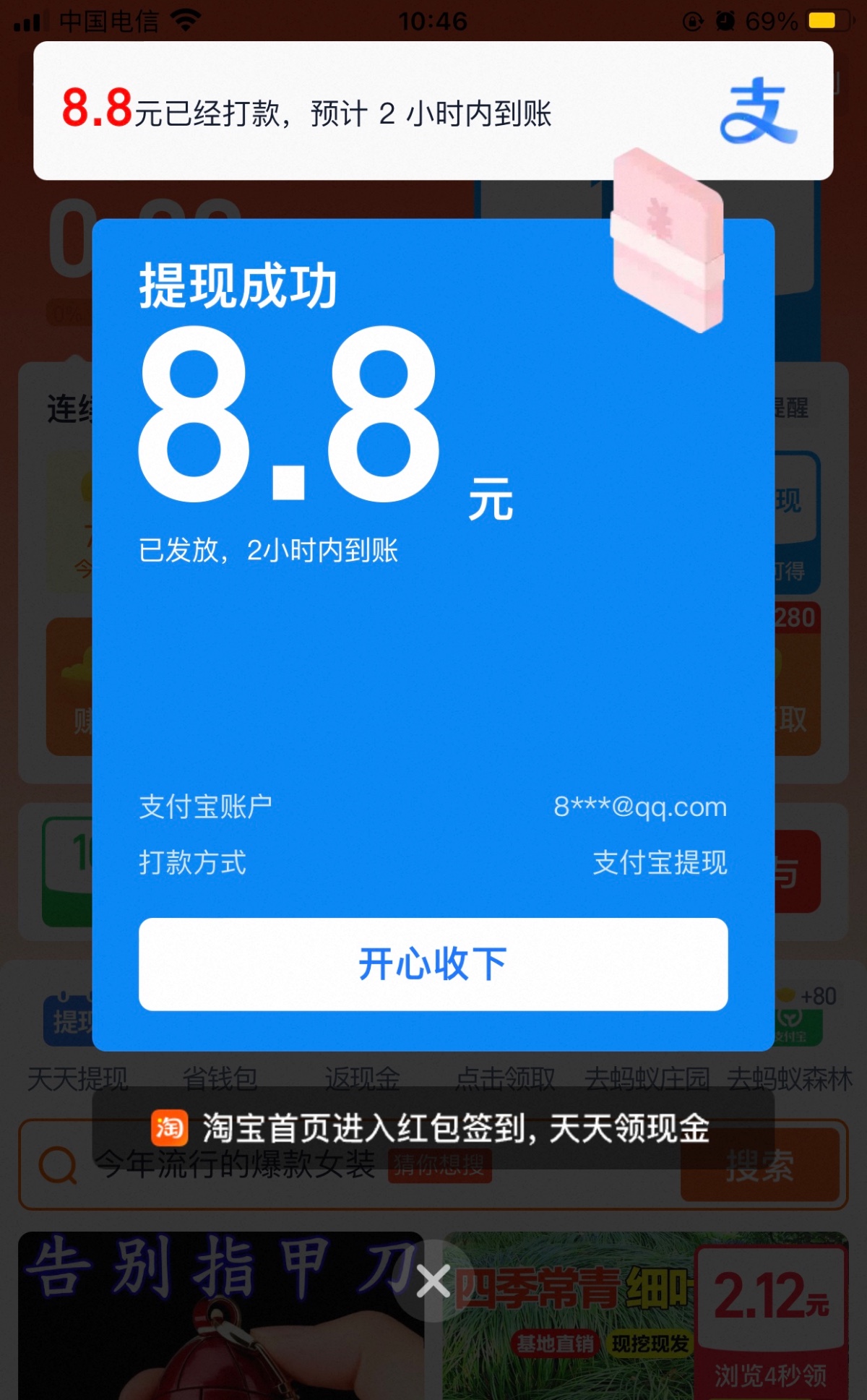 不知道是放水还是因为我是第一个搞 两个号都是8.8 打开淘宝点我的然后下面有个红包签到点进去 一般都是进去自动弹窗然后点一下开就行 抽多少看运气 骂人的中出