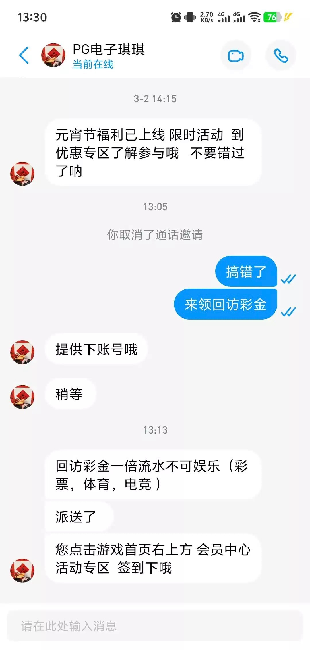 我没接到电话 直接去找在线客服说回访彩金碰的 网址 049.com pg.cc