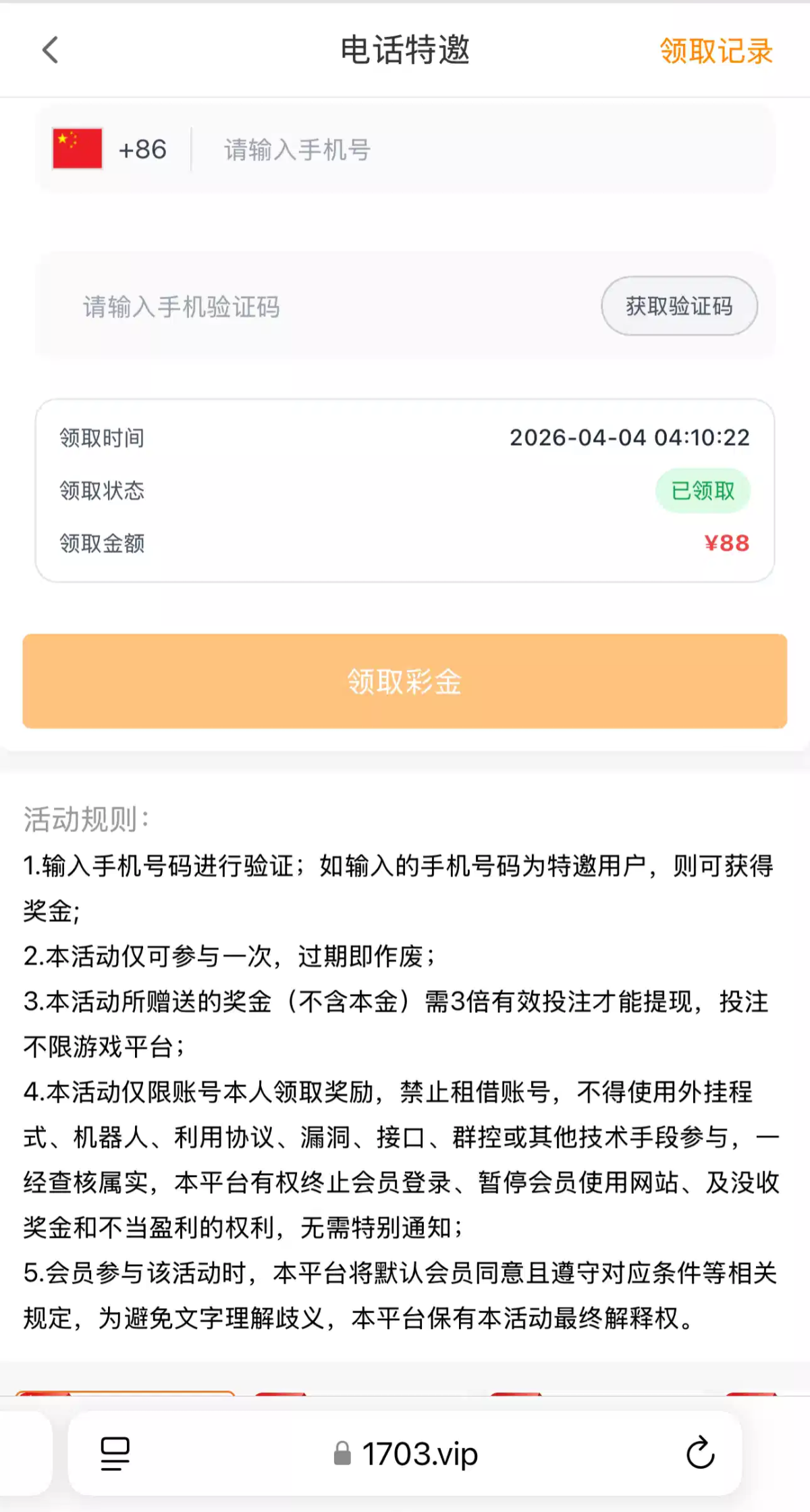 注册绑定,优惠里面第一个就是手机号自助领取三倍流水,