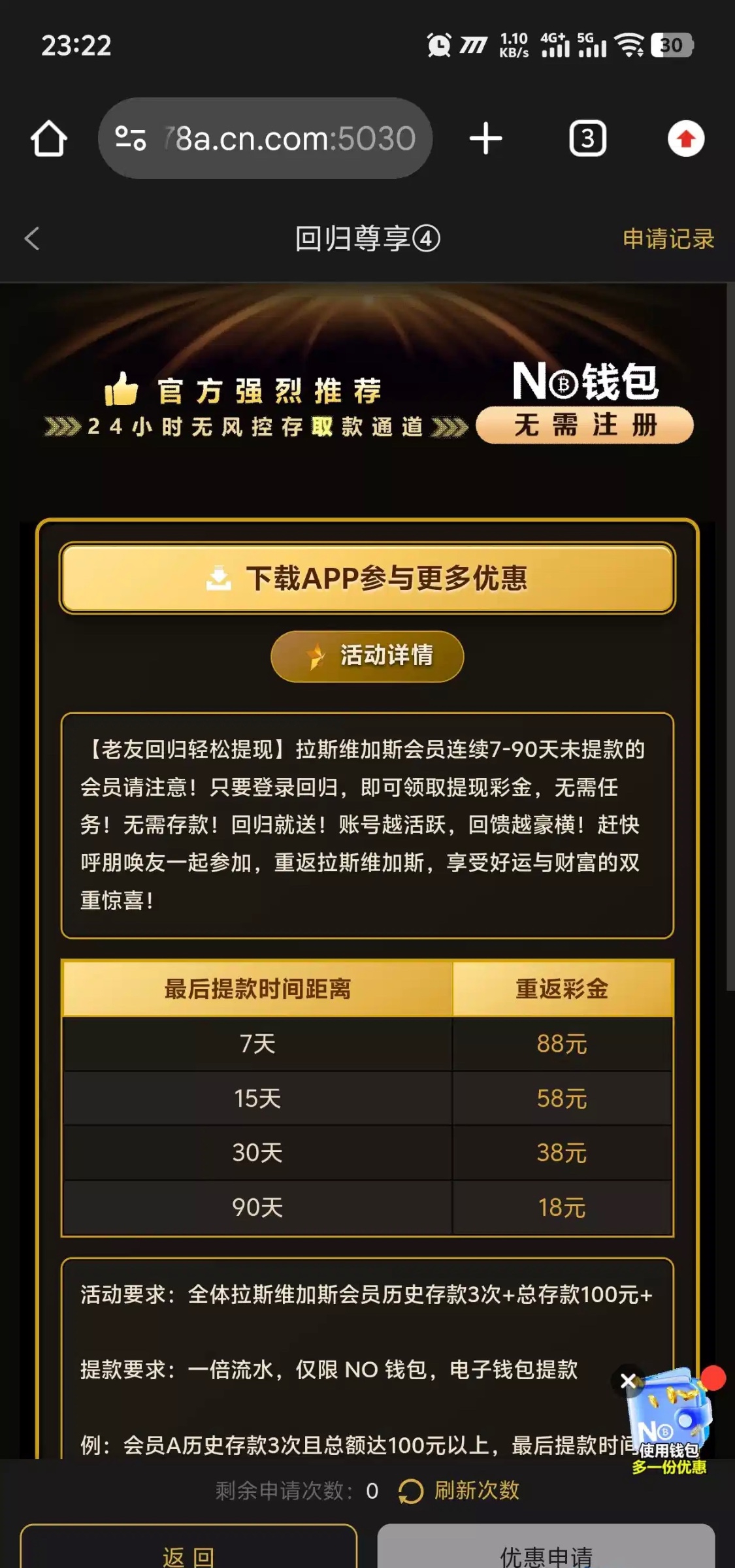 充值过的去吧,没充值过的估计没有,优惠回归那里还有最后一笔提现回归彩金,网址:0678.com