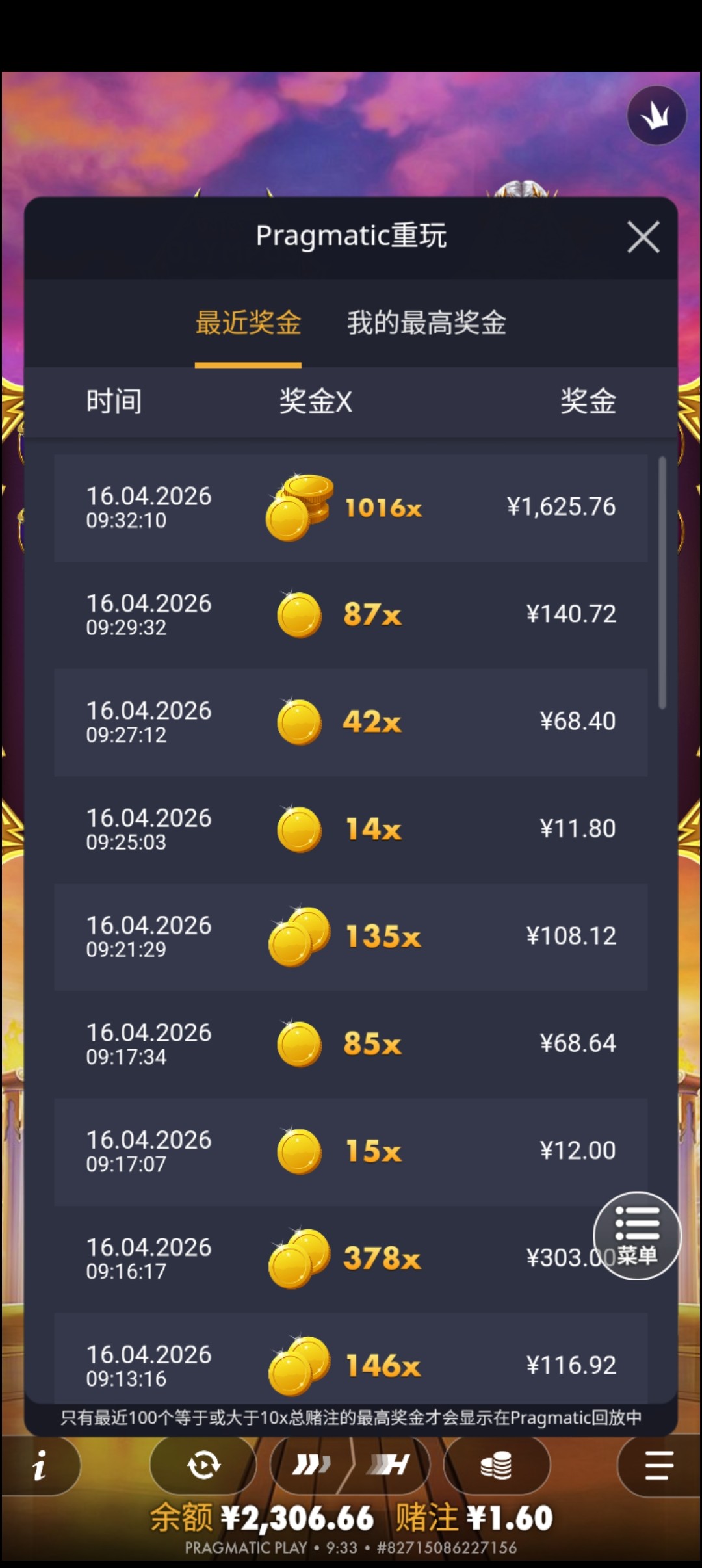 然后最后15块,早上6点的时候冲进去还是诸神0.2,最后一下进了给了500多倍,有100多块钱,然后就pp奥林匹斯