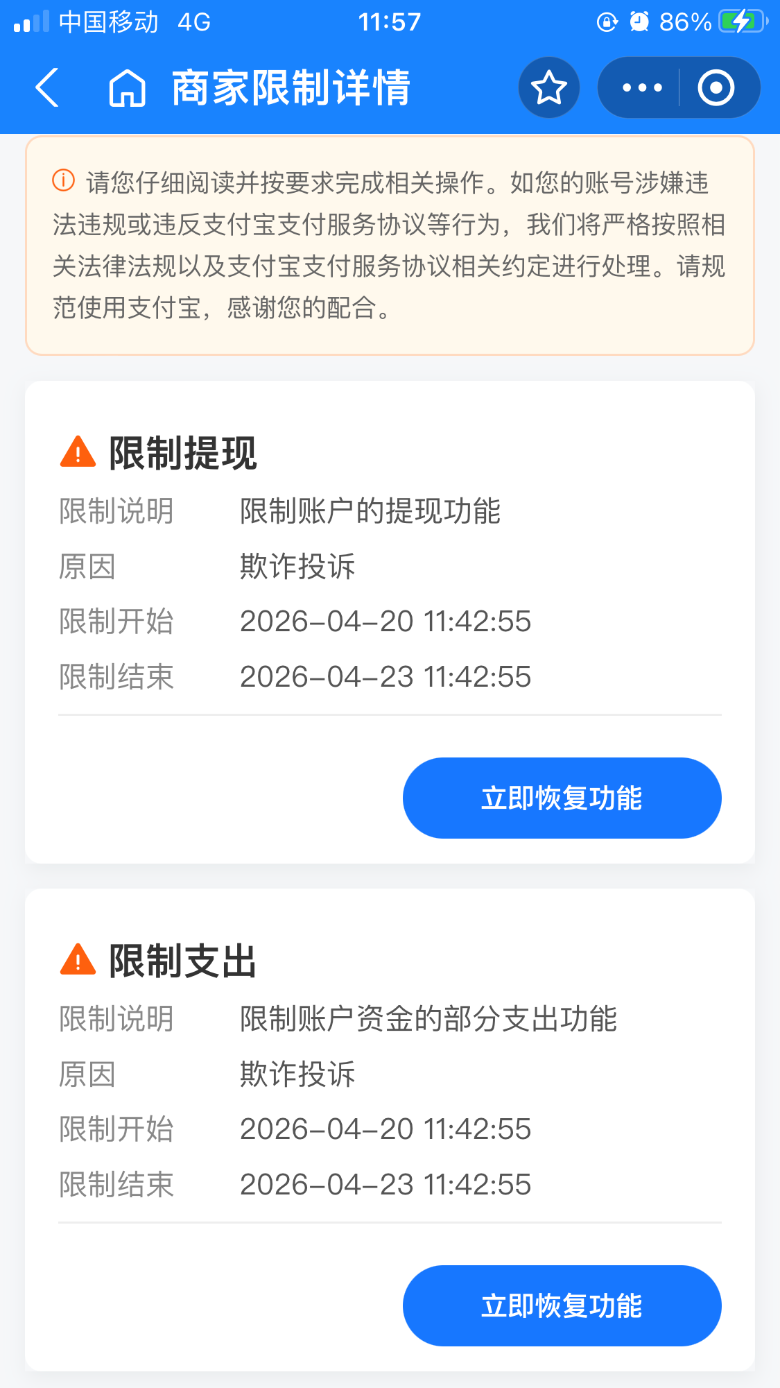 遇到个傻逼,从我这买了400钱能币,反手把我支付宝举报让我给他退款不退款举报我,17号被封三天,今天又被这傻逼举报了又封了三天。